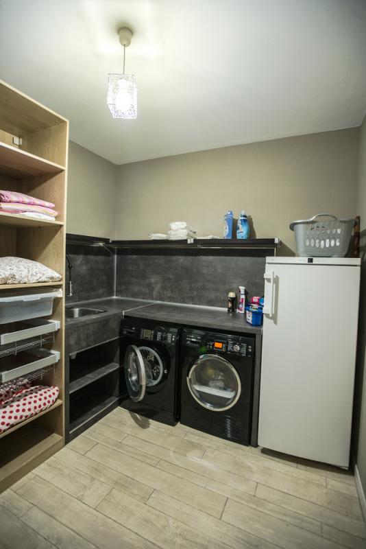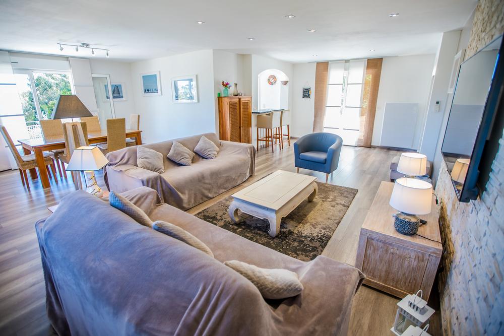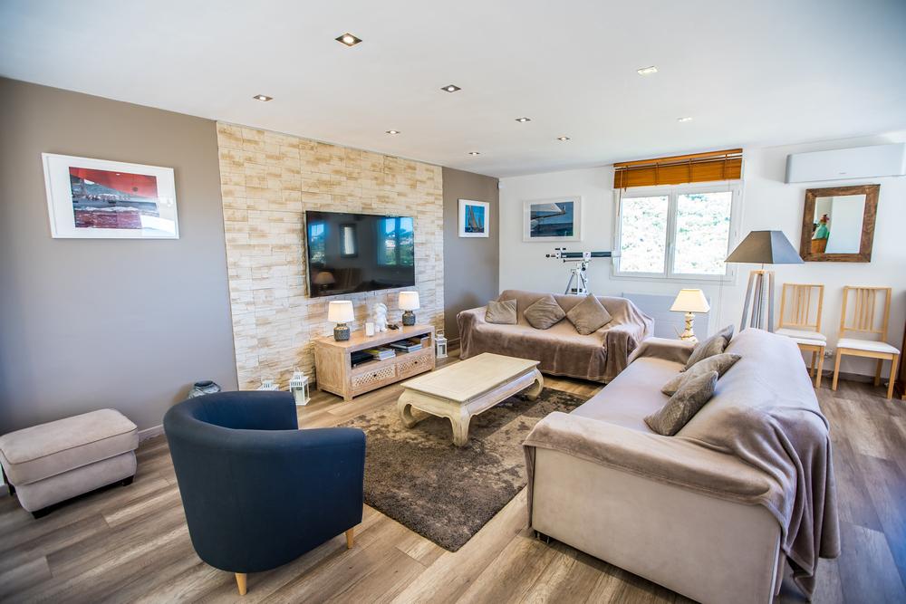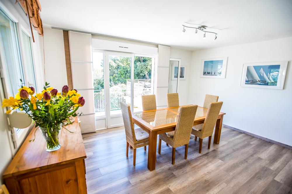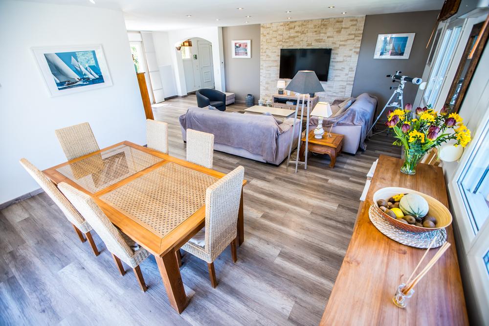 The large living room and open-plan kitchen have lots of natural light and open to a sunny deck. Two large motorised awnings provide the deck with shade.